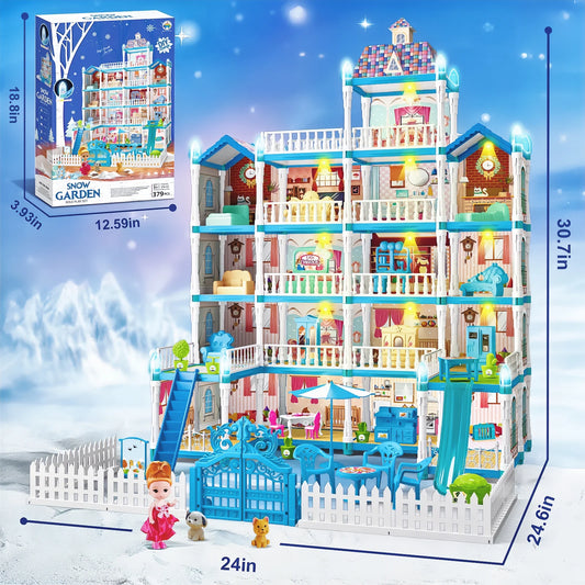 379 Pcs Princess Dollhouse for Girls, Light up Frozen Garden DIY Set, 17 Rooms w/ Doll, Puppies, Furniture, Accessories, Toddler Birthday Christmas Playhouse Gift Toys for Girls 3 4 5 6+